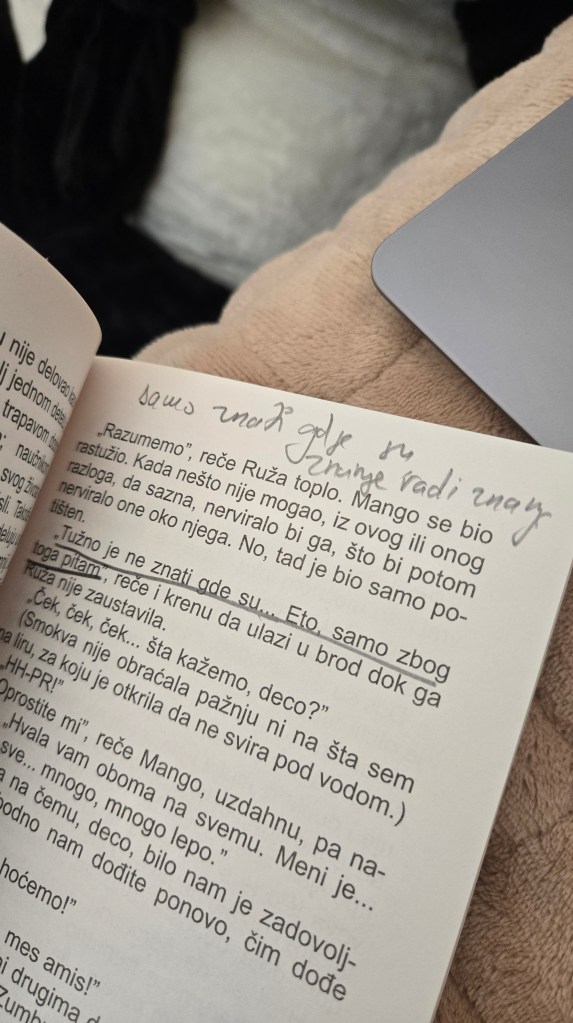 Roman je pisan pažljivo i promišljeno; tokom čitanja hvatala sam bilješke, neke sam uspjela zabilježiti, neke su ostale u pamćenju – što je možda i najjači pokazatelj utiska koji knjiga ostavlja. U jednom cijelom poglavlju, autor gotovo velikom narativnom parentezom dopušta čitaocu da tugu doživi kao jedinstvenu, jer ona to i jeste. Vidi poglavlje IX ako te baš mnogo zanima.